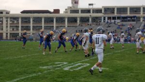 Then on the ensuing kickoff, the bulldog special teams forced a Warrior fumble, AJ Jimenez recovered the fumble at the Warrior 29. Senior Mike Repsher cashed it in on the first play, Abidelli converted again on the two-point conversion making the score 23-14.