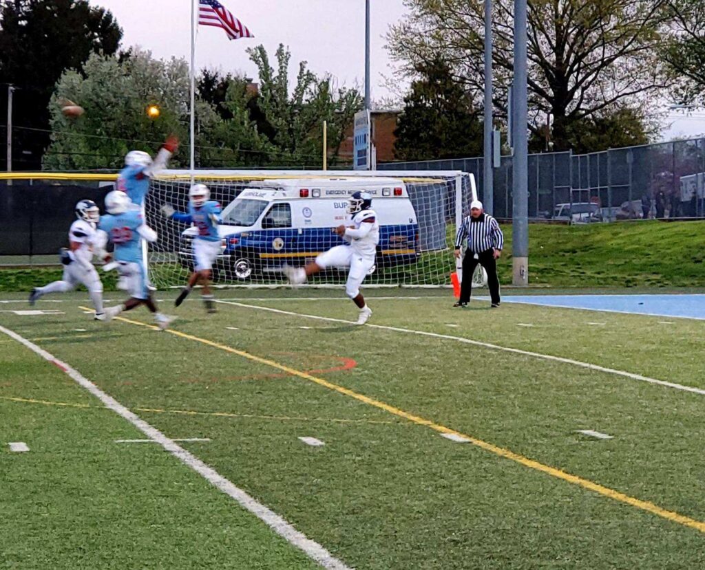 West Catholic quarterback Naidir Hillard attempts a pass in Friday night’s loss against the Father Judge Crusaders. April 16, 2021. Photo by Daniel Reed.