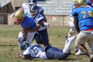 Saturday afternoon at Frankford Stadium, the homestanding Pioneers stuck to a crushing ground game for four scores. Three of them by Saron Banks from 1, 6, and 3 yards out. Also with a two point conversion. Tailback Nadir Mitchell started the scoring in the second quarter, with a 1 yard run up the middle after scoreless first quarter.