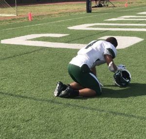 An emotional Elijah Vargas kneels in the endzone after his team held off the Cougars