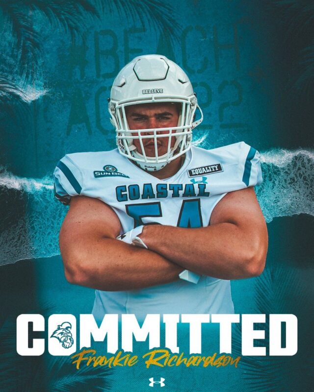 Coastal Carolina has found the Keystone State. Head Coach Jamey Chadwell and staff have extended several offers to recruits in Pennsylvania in the last couple years, and for the first time since landing Downingtown West punter/kicker Massimo Biscardi in 2018, the Chanticleer’s efforts have paid off. Gettysburg lineman Frankie Richardson was ready to ride the wave and this past Thursday surf was up. The 6-5, 285 pound offensive tackle announced on twitter that he was committing to the Coastal program: