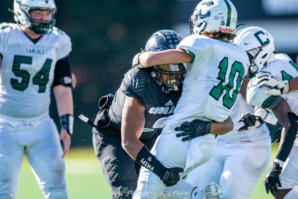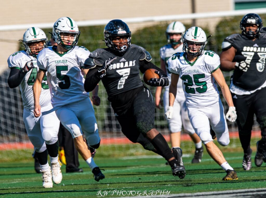 “Harrisburg played a hell of game. They’re a good team. Their team speed gave us fits all day” said Carlisle head coach Brett Ickes. Speed didn’t play a role on Harrisburgs next score. It was the field position game. Hopkins buried a punt deep at the one, but couldn’t muster much offense. Terrell Reynolds ended any hope of a drive when he sacked Carlisle qb Louis Shank for a big loss. After the punt the Cougars only needed 32 yards for their next score, this one a 3 yard run by Hopkins.