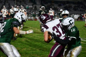 Scoring slowed down in the 3rd not being till 5:11 left in the quarter that Conrad Moore kept the ball for a 7-yard run. WIth Spitler’s kick State was up late in the 3rd 28-21. Just under 4 minutes later with 1:16 remaining in the quarter, Moore would find Jashaun Green for his second touchdown catch of the night on a beautiful goal line fade. The State defense was able to continue imposing its will finally in the second half slowing the rushing attack. After an uneventful beginning to the fourth quarter at 6:53 left in the game, Aiden Spitler was able to keep his 100% in kicks made for the game as he made the field goal. His kick made it 38-21 State leads. Carlisle would score again with a two-point ending this game State High 38 Carlisle 21.