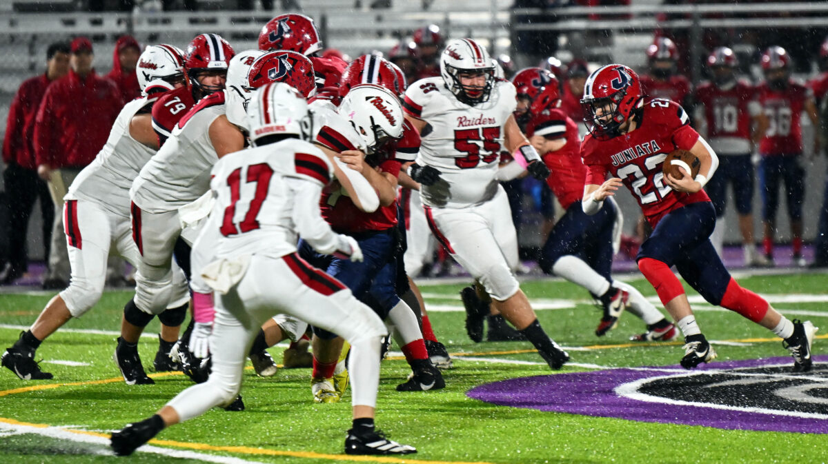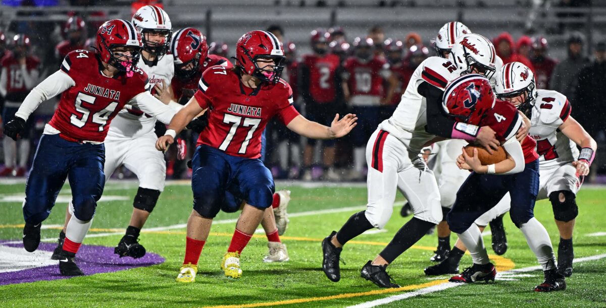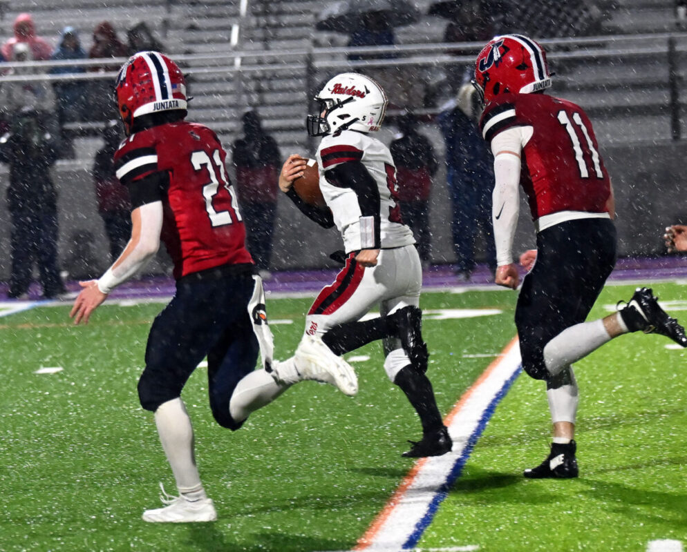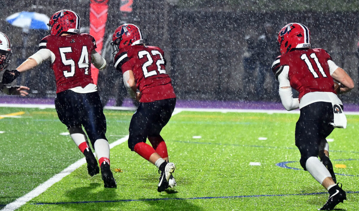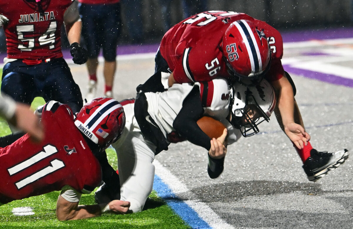 The rain fell hard at times in Bellefonte, but in the end it didn’t dampen the Bellefonte celebration. They won their first district title in 6 years by defeating Juniata 17-6.