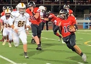 Alex Conrad (#16,wearing red) looks to make a run away from Brownsville’s Patrick Shumar (#66, wearing white)