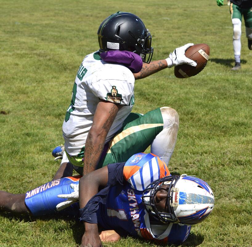 Battle of the trophy! Wilkes Barre Warriors retain trophy in victory over Electric City Skyhawks. 64-30 final score!
