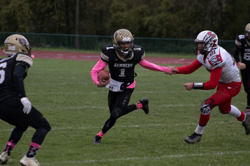 Iroquois with a 5 yard TD run, which JFK matched with a 20 yard TD run. Maintaining their lead. Iroquois scored again, two minutes later to tie it. Looking like overtime was inevitable. JFK was forced to punt. And in less than a minute, with a running clock and no time outs, the Iroquois Braves stormed down the field to score on a 1-yard TD run with 17 seconds left. JFK only managed one play before time expired. Iroquois won, 42-36 to close out their respective seasons.