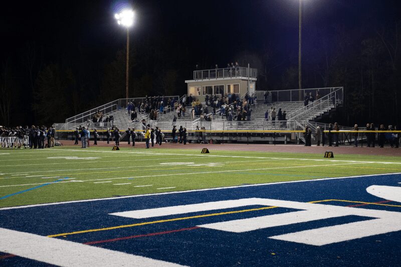 A 4pm start, kicked off at 3:45, including the long injury delay, finished off at 6:07 in the twilight. The only other game taking place Wednesday was less than a half hour away. East Aurora/Holland was hosting Springville Griffith. Springville’s second ‘match game’ of the season. Sitting at 0-8. The East Aurora Blue Devils had just renovated their EA Stadium, and installed new field turf. An outbuilding isn’t finished, so the restrooms were portapotties.