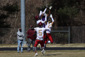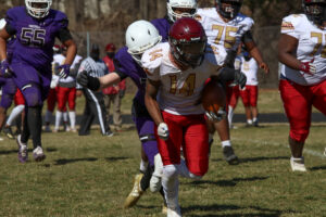 New Town would get a fine 16-yard run b #6 to set the tone for this game. A short time after the run #14 hauled in a nicely thrown ball from #3 to pick up 20-yards, with 8:25 left in the opening quarter. The 8-play, 57-yard drive concluded on a 1-yard score from #6. By the end of the day #, 6 would make it clear he is going to be a force in the spring season. A two-point conversion pass would fall incomplete keeping this a 6-0 New Town lead, with 7:35 showing on the clock.