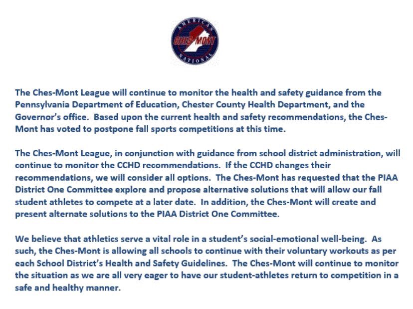 Also in D1, the Ches Mont league just announced they are moving for a spring season of fall sports. Statement below: