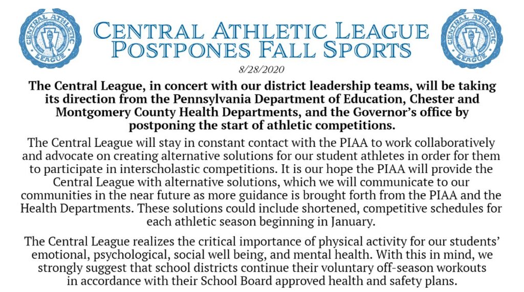 Central League postpones fall sports; Latest in postponements & teams continuing with football this fall, full state fall postponement list included