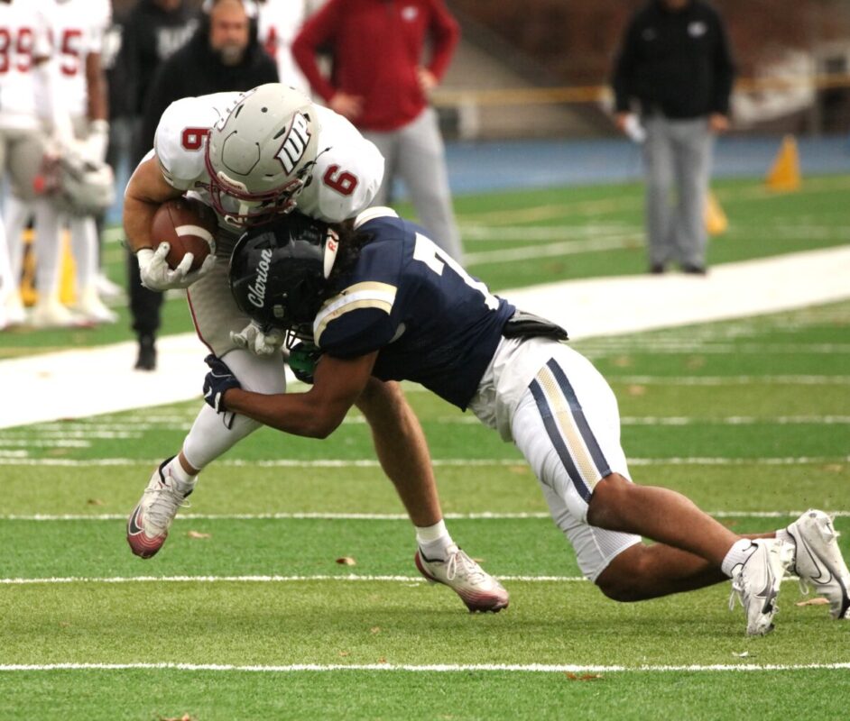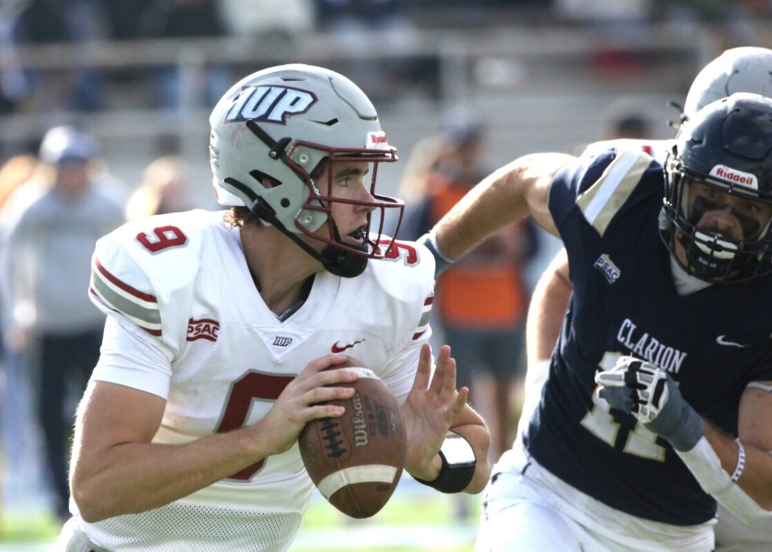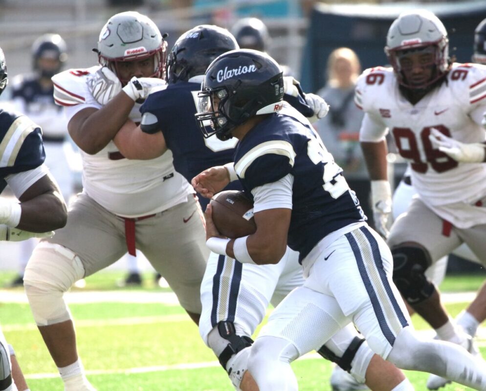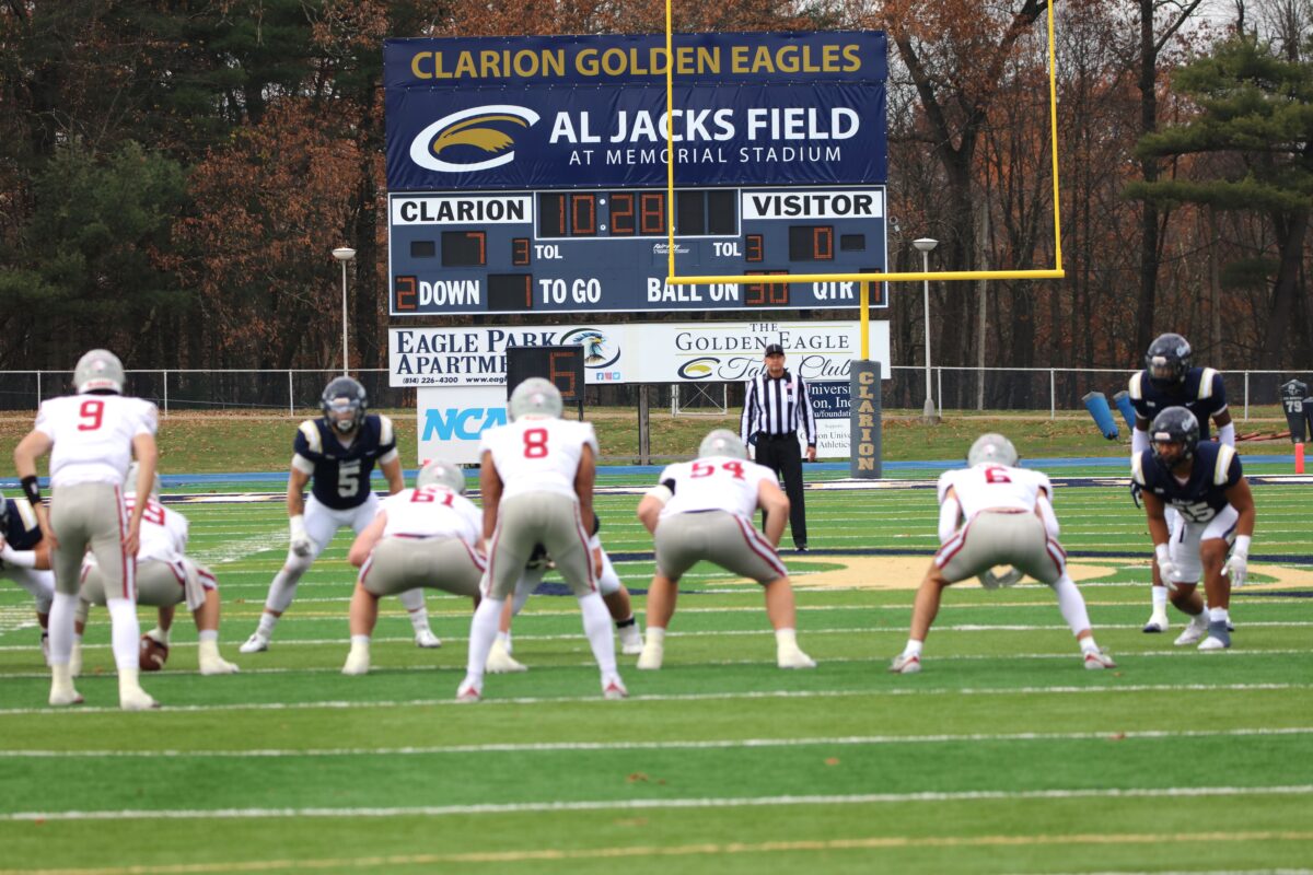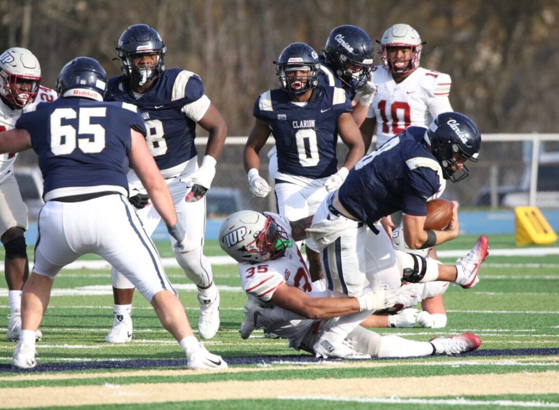 In a home field heartbreaker, the Clarion Golden Eagles (6-4) lose a PSAC west division game against the IUP Crimson Hawks (7-2) late in the 4th. 45-42 (photo gallery)