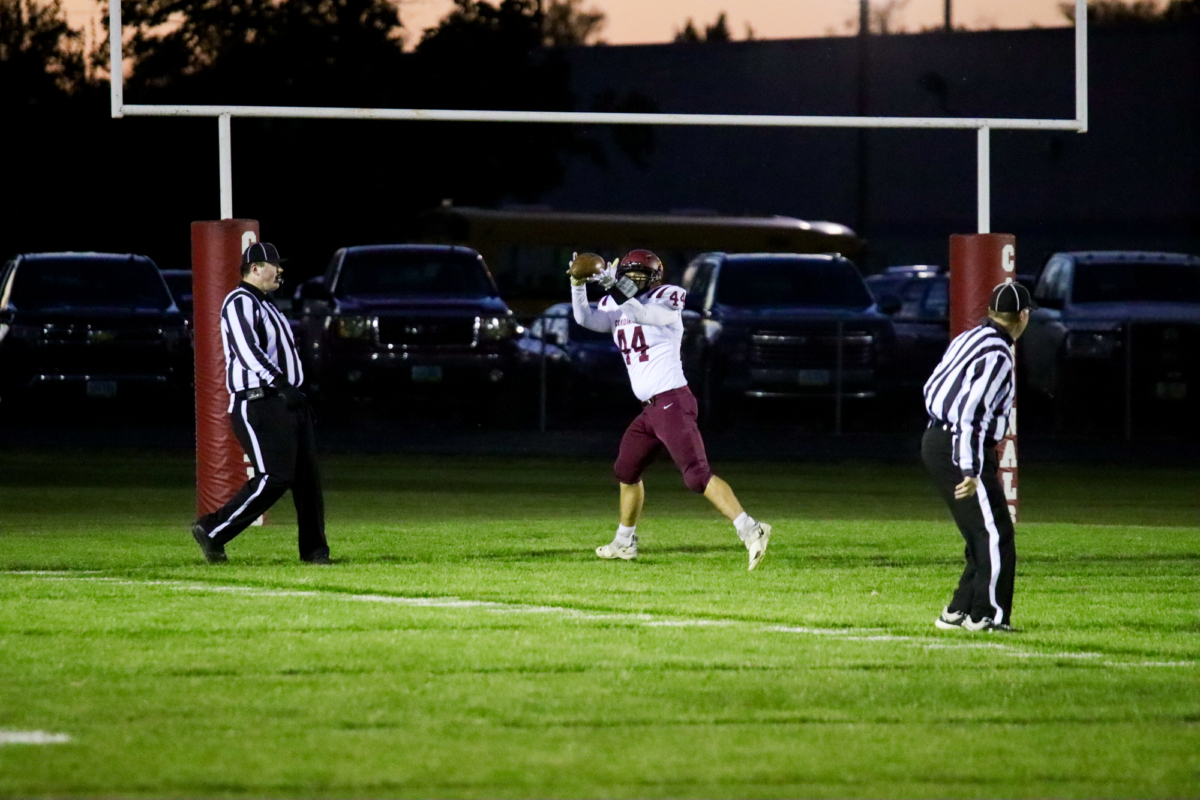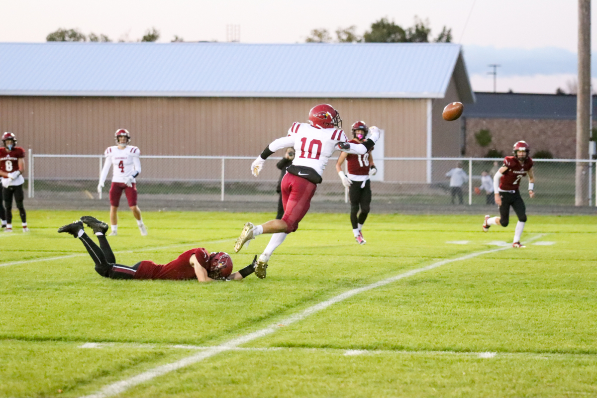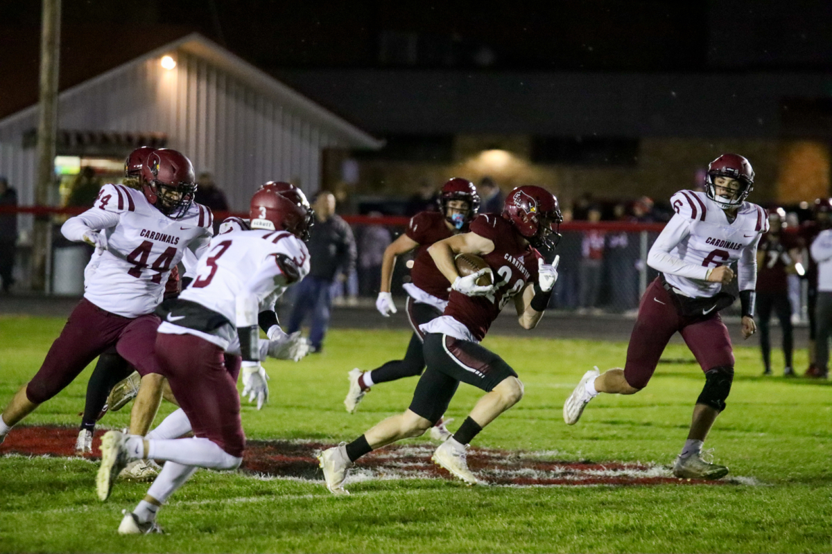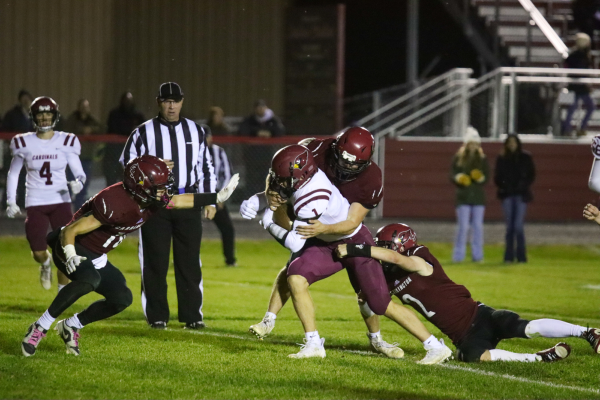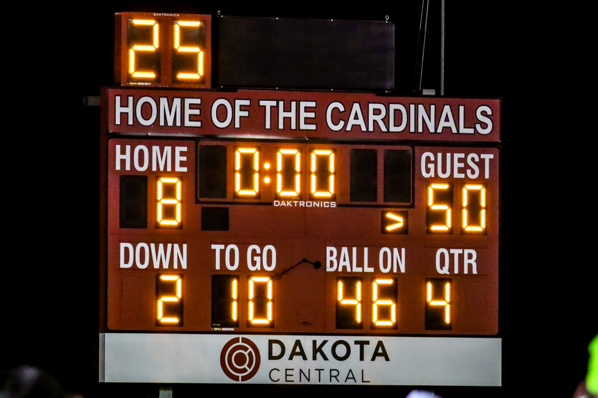 Mason Romfo would record three touchdowns. Including the opener in the first quarter. Oshun High Hawk would score twice. While Jax Johnson and Rayce Worley would each score once. Giving the visiting Cardinals of L-E-M a comfortable, 50-8 victory. Meanwhile, Logan Weninger would score on a four yard TD for the Carrington Cardinals.