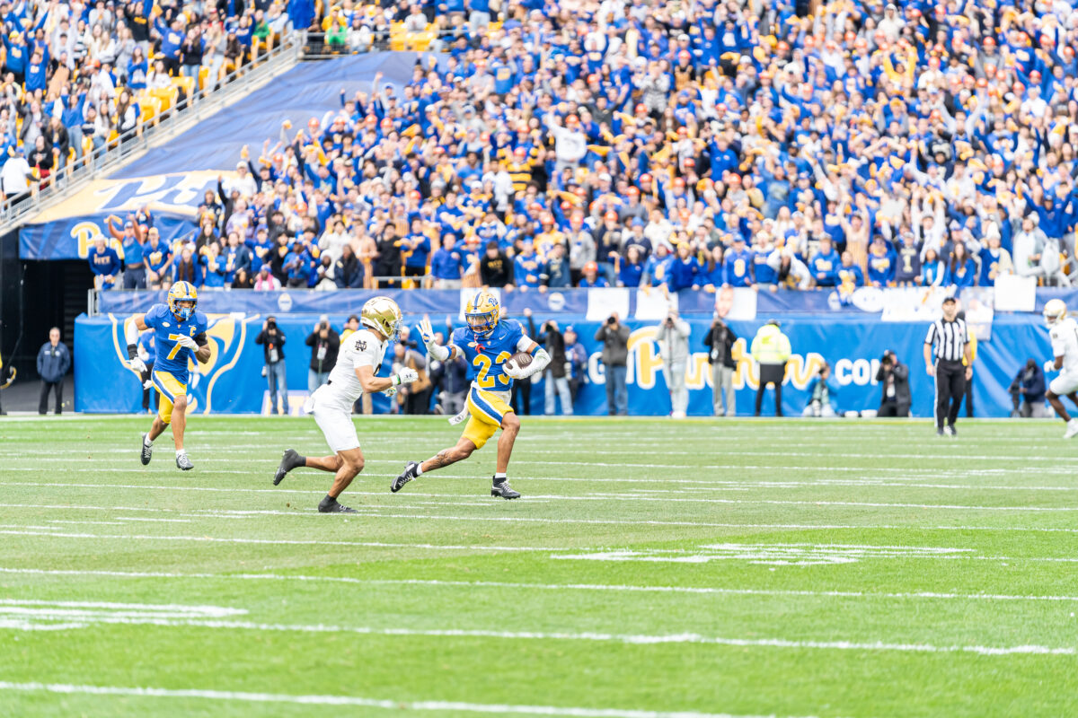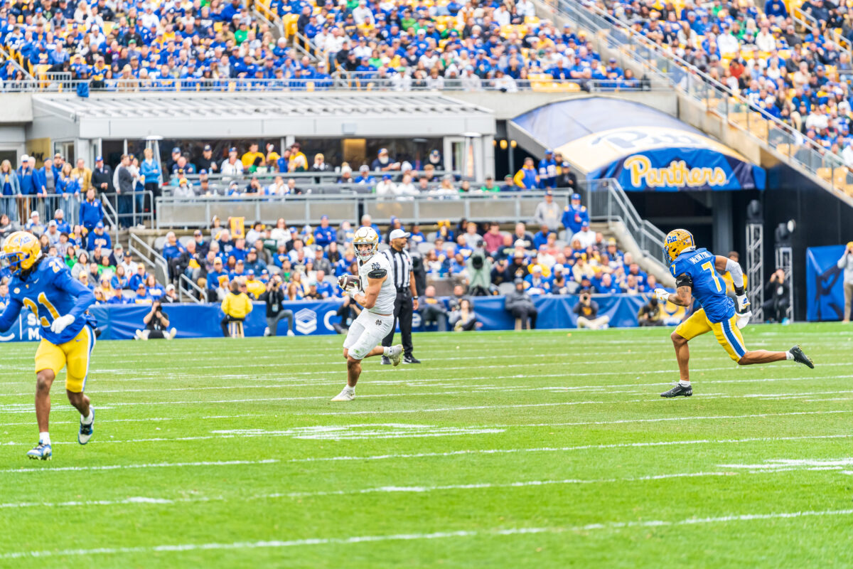 The scene was set at Acrisure Stadium in Pittsburgh — a crisp, cloudy afternoon, wind at the southwest at 11 mph, and the Panthers hopes riding high with a 7-2 record. The Fighting Irish, ranked No. 9, walked in with something to prove. From the first snap, Notre Dame wasted no time. On their very first play from scrimmage, star running back Jeremiyah Love exploded through the line, spun away from a defender, and raced 56 yards for a touchdown. Just like that, it was 7-0 in the blink of an eye. The momentum doubled almost instantly. On Pittsburgh’s next possession, Notre Dame’s defense delivered. Safety Tae Johnson snagged an errant pass and returned it 48 yards for another score. Suddenly it was 14-0, and the Panthers looked stunned.