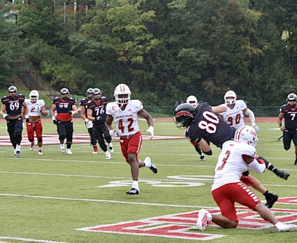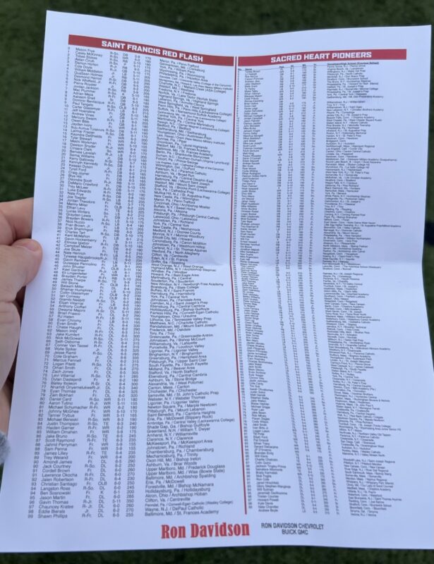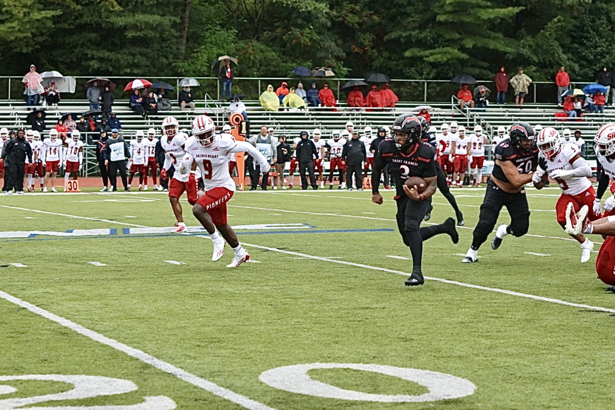 Unfortunately it was a rainy day in the mid 50s and the Red Flash fell to visiting Sacred Heart before 1167 fans. The back and forth game went down to the final seconds. The Pioneers kicked a late field goal to win 37-34. St. Francis led early, fell behind as half ended and tied the game twice in the fourth quarter. Only to lose on a Sam Renzi field goal as timed ended, his third of the game, all from 40 yards and beyond. Both offenses moved up and down the field.The game stats were almost identical (yards, time of possession, special team stats, etc). The difference was an interception on the Red Flashes first possession deep in Pioneer territory, which prevented a field goal attempt. It was the Northeast Conference opener for both teams, so the season is still young.