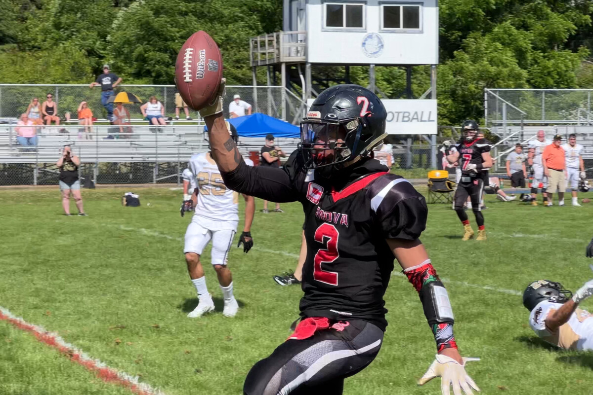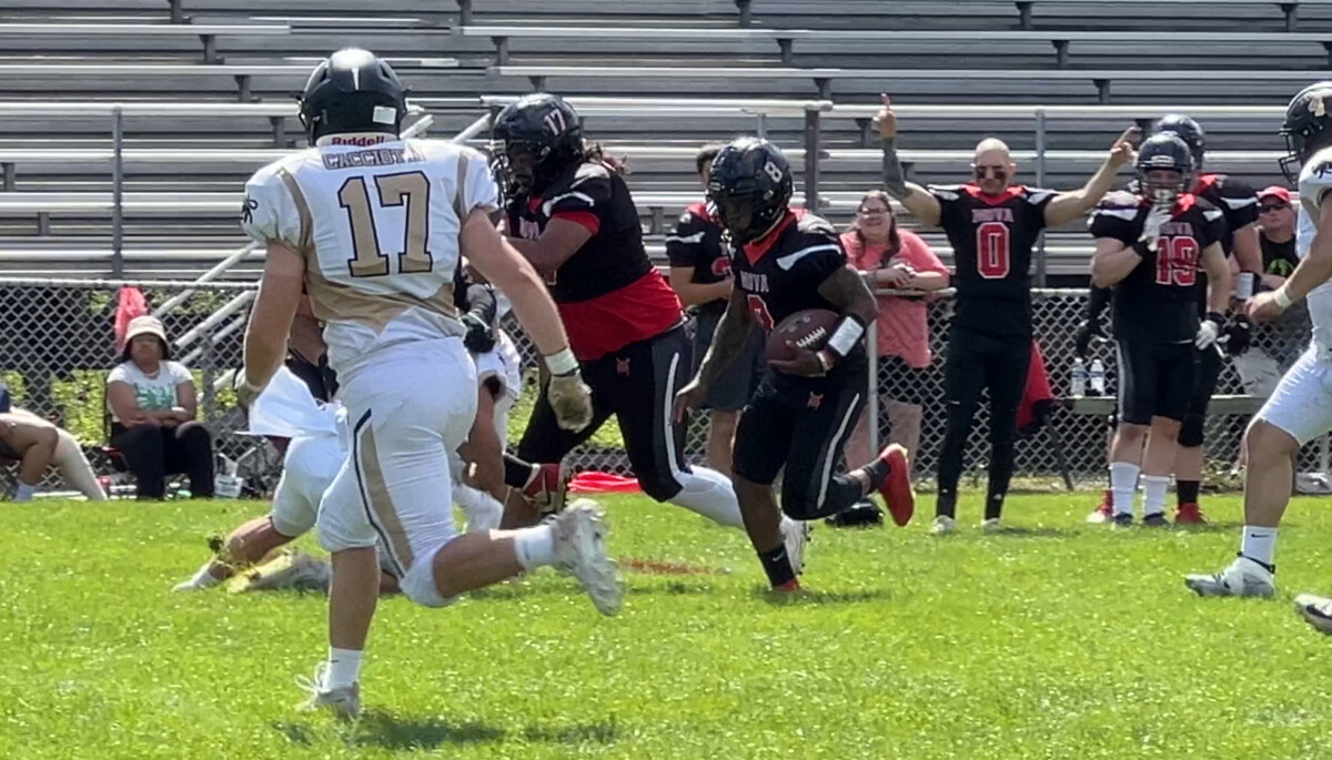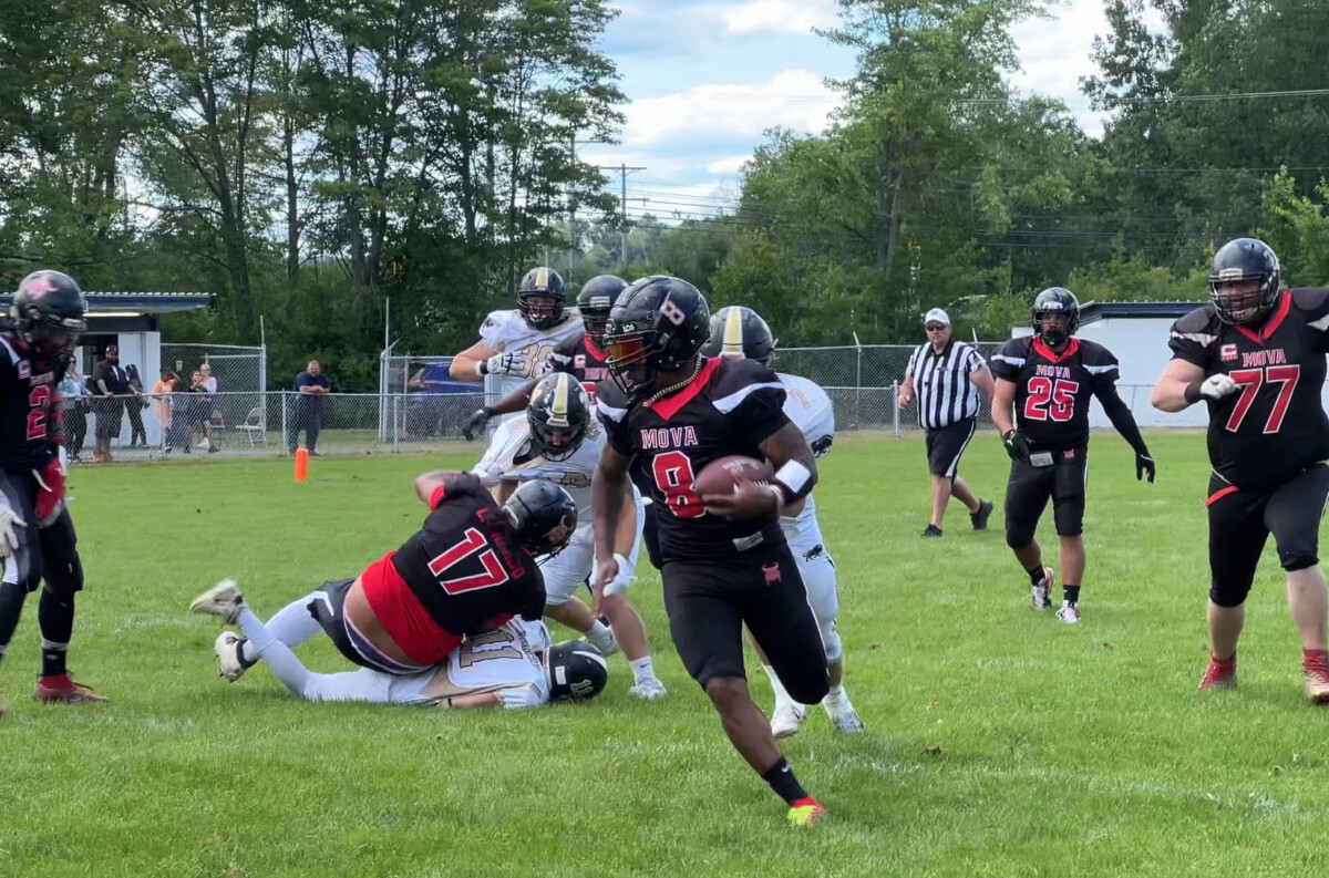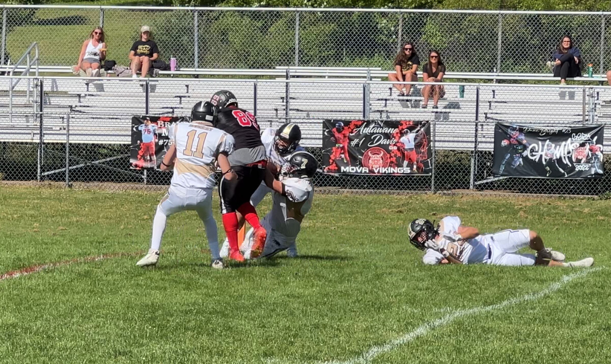 Bedford actually struck first with a 18 yard td pass from Levi Cook to Ian Valente. The duo also hooked up for the two point play to make it 8-0 with just 2 minutes off the board. The scoring came fast and furious in the first quarter. Malik Breon scored on a 5 yard run and the two point play tied the game at 8. The Buffalo offense sputtered and punted the ball to the Viking 7. Greg Medina hit Dane Bright for a 45 yard score after a block in the back put the Vikings on their own 5. Jason Nyhart hauled in the two pointer to make it a 16-8 lead for MoValley. On the very next play Bedford lost the ball and the Vikings recovered on the Buffalo 6. Medina took the ball in himself and the Vikings were off to the races with a 24-6 lead five minutes into the first quarter.
