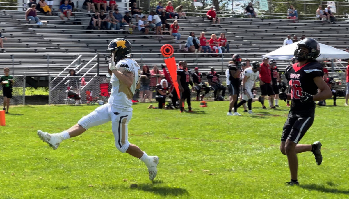The shoot out then became a buffalo hunt, Billy the Kid style. Rob Albro intercepted Cook in the endzone to end a Buffalo drive. The next set of downs proved to be the end of the shoot out for Bedford. Medina ran for 18 yards, then Breon scored again and Nyhart hauled in the two pointer to make it a 52-28 lead. The Vikings then recovered and onside kick at their 13. It took just one play, a Medina toss to big TE Trei Gilcrist. He ran downfield with surprising speed, then carried a host of Bedford players into the endzone to make it 60-28.
