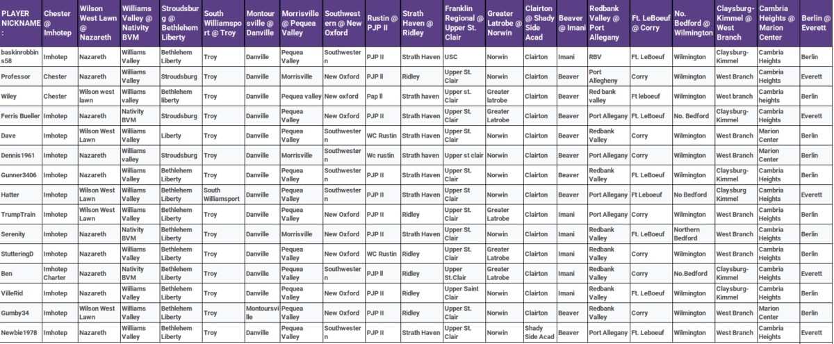 This week’s docket contains some interesting early season matchups. West Chester Rustin (#5 5 A) travels to Pope John Paul II (#4 4A) for a Saturday morning tilt. Rustin will be tested in their PAC and ChesMont crossover games with future games against both Downingtowns. The Pros all pick Rustin, which after last weeks mess, bodes well for PJPII. Stroudsburg visits Bethlehem Liberty, to battle it out in the Poconos. Out west Beaver invades Imani, while Red Bank Valley visits Port Allegany.