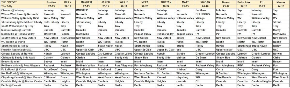Heading into week #3 ProTime Phil, along with Bossman Billy and Mayhem are tied for the lead of the ProTime Pick’em Challenge. Certainly, there is no surprise that ProTime Phil, the two-time defending champion is on top or that the Bossman who always starts fast then fades away sits along side ProTime, then there is Mayhem. The King of the SOL, Mayhem has left his comfort zone of the Suburban One League to become a Commonwealth wide savant, who intends to knock ProTime Phil off of high perch and take the Challenge title this year.