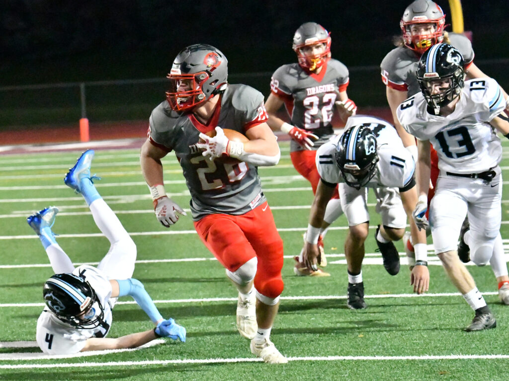 The Dragons wasted no time scoring Friday night. On their first possession of the game on fourth and three, Hoenstine kept the ball ran to the left and scampered 46 yards for the score. Hunter Smith made the pat to give the Dragons an early 7-0 lead. On their following possession Hoenstine connected with Eli Lingenfelter for 41 yards down to the four-yard line. Lingenfelter finished the game with 105 yards receiving and two touchdowns. The very next play Parker Gregg bulldozed his way into the endzone. Smith missed the pat making the score 13-0 Dragons.