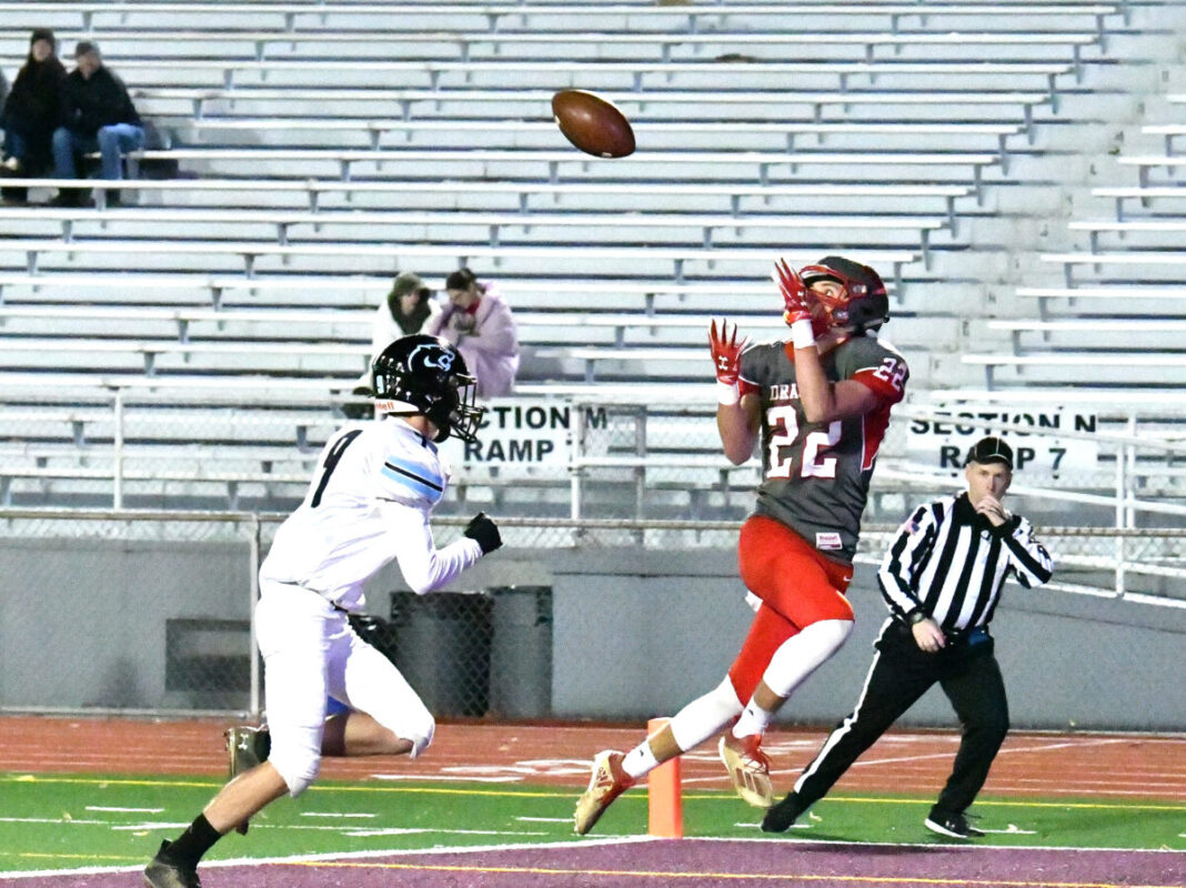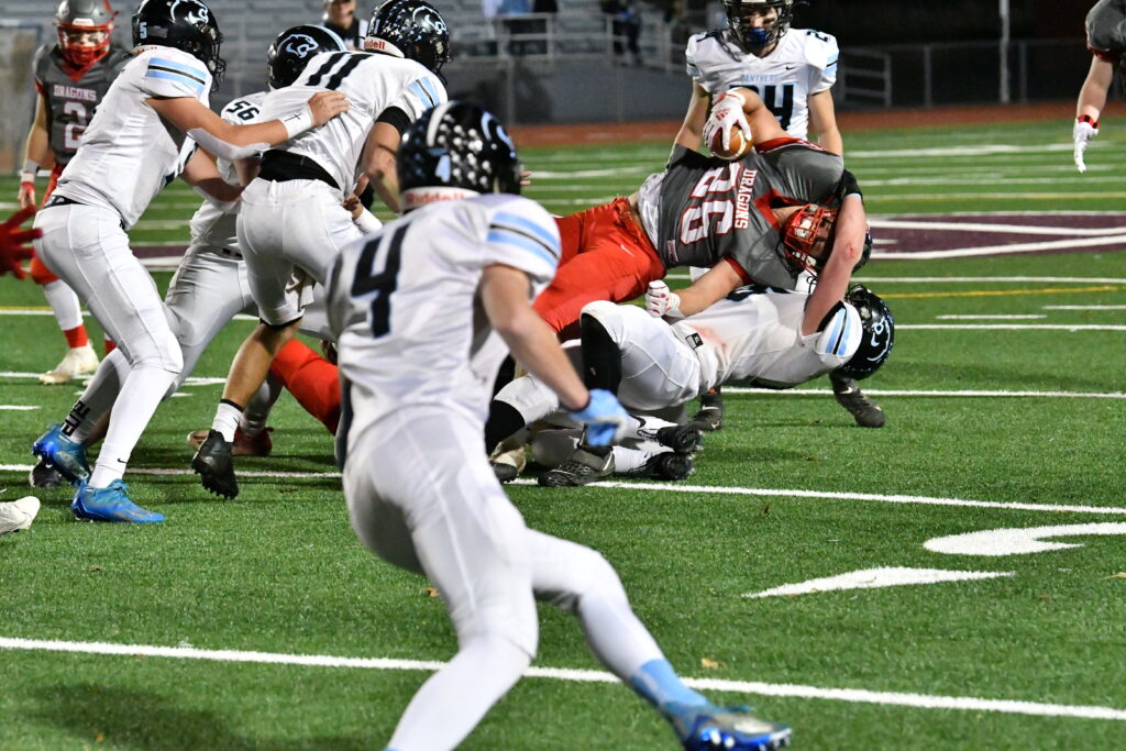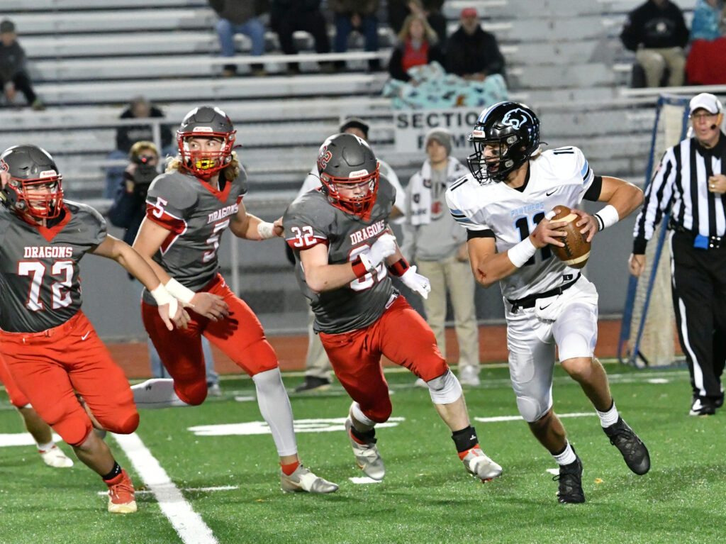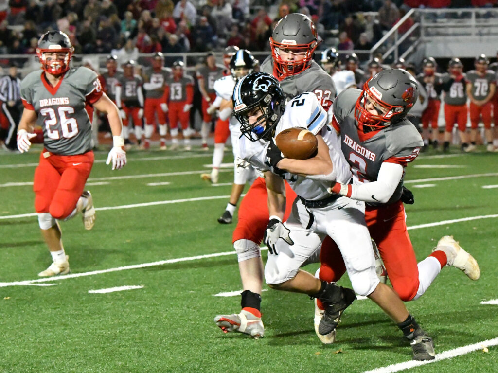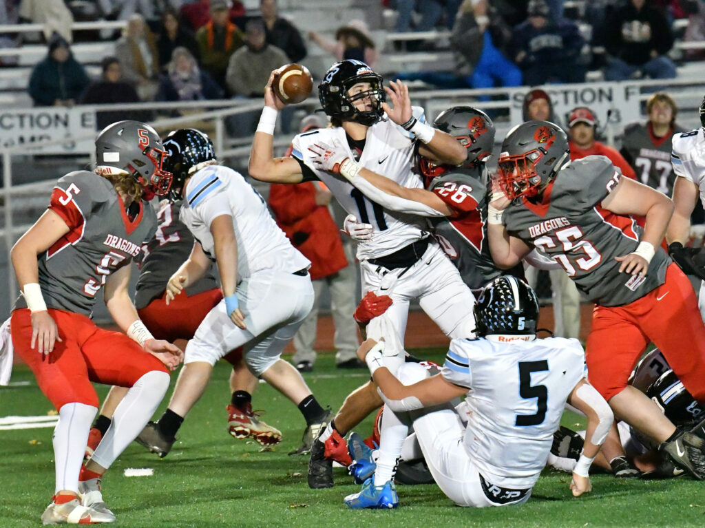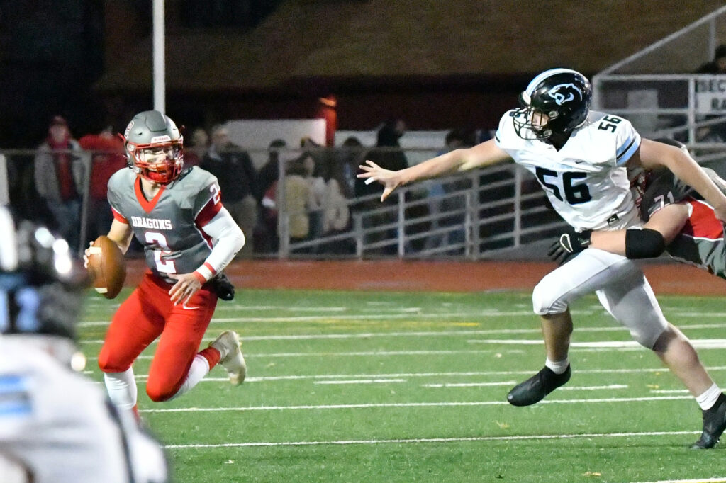 The Dragons wasted no time scoring Friday night. On their first possession of the game on fourth and three, Hoenstine kept the ball ran to the left and scampered 46 yards for the score. Hunter Smith made the pat to give the Dragons an early 7-0 lead. On their following possession Hoenstine connected with Eli Lingenfelter for 41 yards down to the four-yard line. Lingenfelter finished the game with 105 yards receiving and two touchdowns. The very next play Parker Gregg bulldozed his way into the endzone. Smith missed the pat making the score 13-0 Dragons.