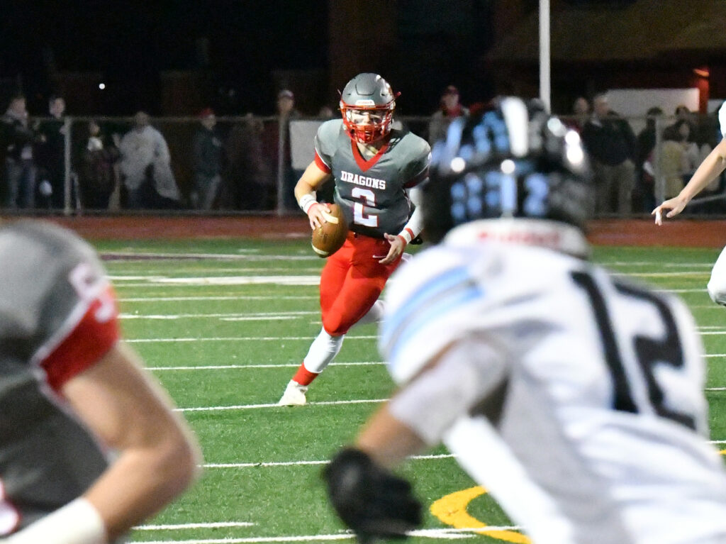 On the first play of the second quarter, Hoenstine flipped the ball to Smith and Smith took it around the outside for a six-yard touchdown. After a successful two-point conversion the score sat 21-0 Dragons. Later in the quarter, Hoenstine would connect with Gregg from 30 yards out to extend their lead to 28-0. Later in the quarter, Hoenstine would connect with Lingenfelter from 15 yards out. After a Smith pat, the score was 35-0 Dragons.