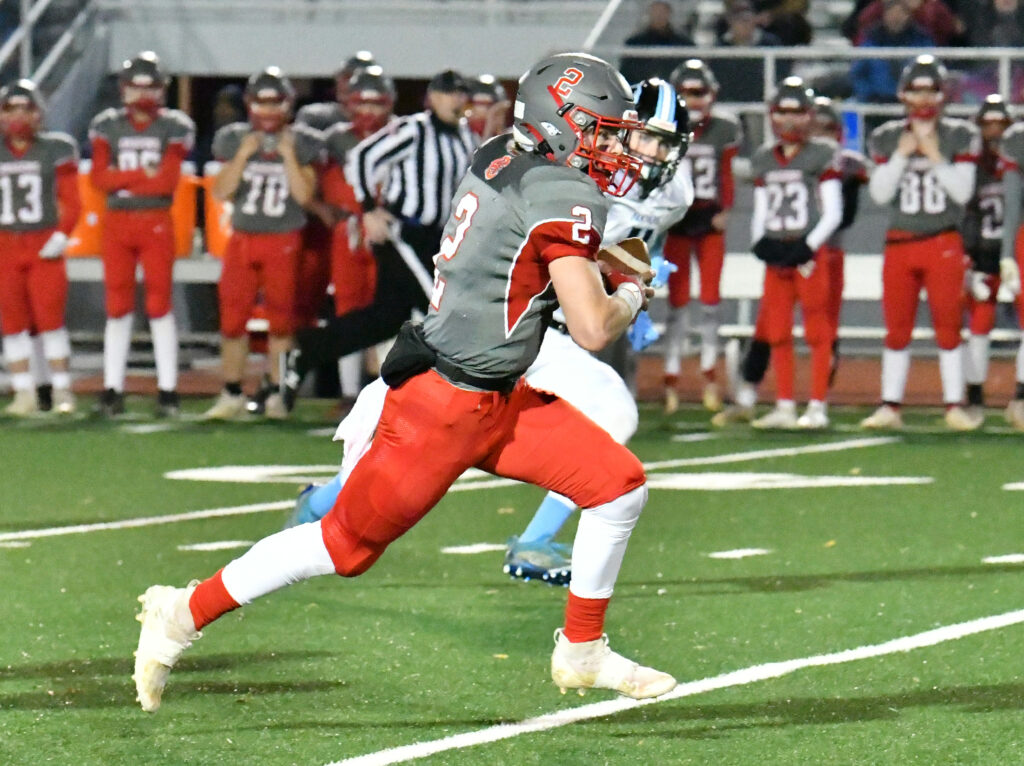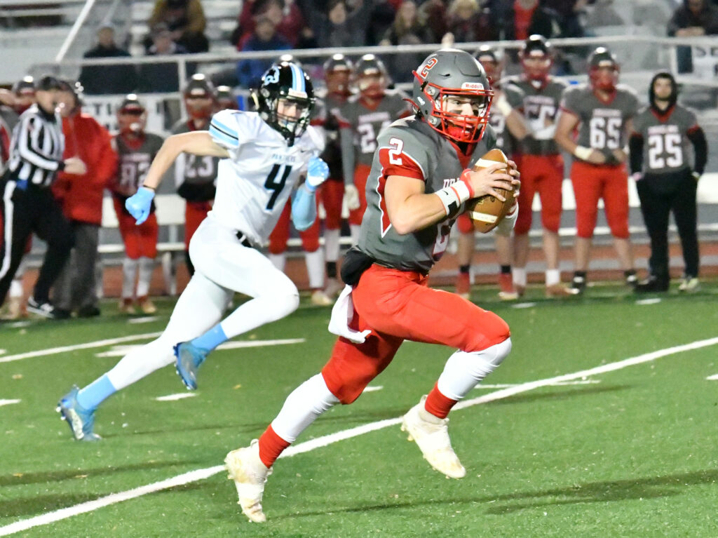 Parker Gregg runs the ball in Friday’s 42-7 victory over Penn Cambria. Photo by: Leo Murray, Friday, November 12, 2021.