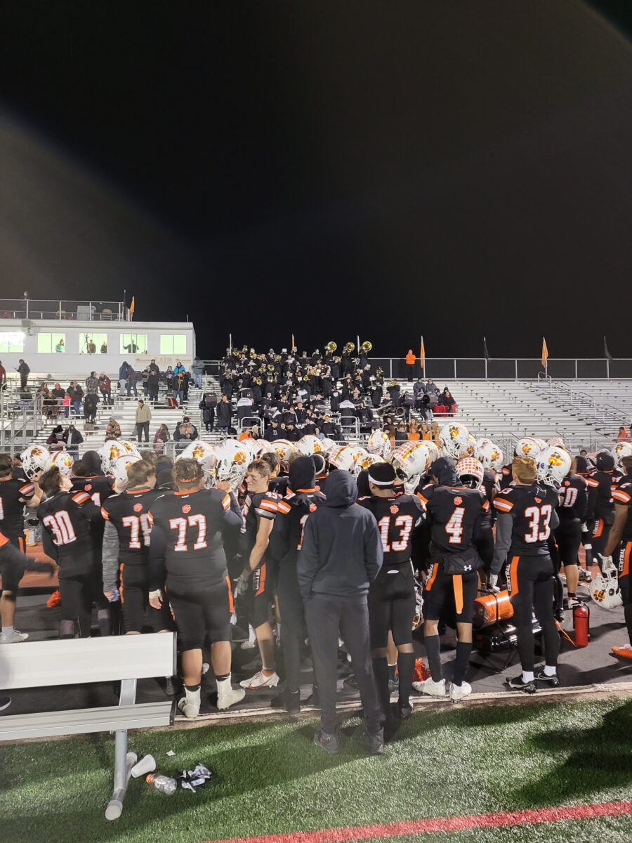 Central York players and the band sing the Alma Mater after a 26-14 win Friday night over Manheim Township