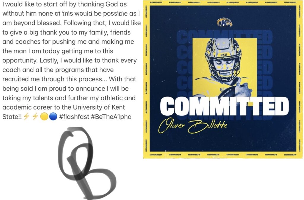 It’s not often you see a quarterback that’s 6-5, 250 pounds. That’s what I say to myself every time I say Clearfield play. Oliver Billotte is that QB. That said, it’s his destructive force on defense that teams aspired to have in their programs. Billotte had offers from several schools, but after a visit to Kent St for a game his decision was made. He committed to the Golden Flash program on Friday.