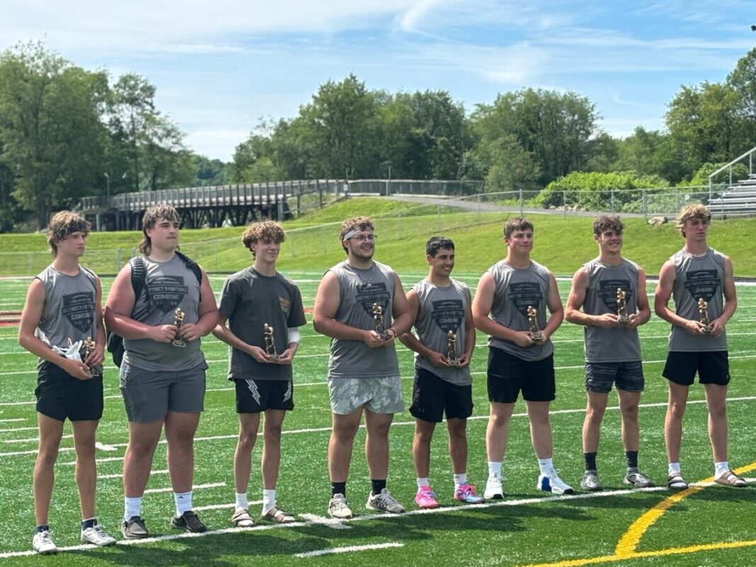 Awards by position at the D-9 combine (left to right): Mason Burford, Central Clarion (MVP); Jimmy Kerr, Central Clarion (OL); Jackson Moss, Coudersport (DB); Carson Neeley, Port Allegany (DL); Malachi Zucal, Cameron County (RB); Johnny Varischetti, Brockway (LB); Blake Pisarcik, Brockway (WR); Braylon Wagner (Redbank Valley (QB).