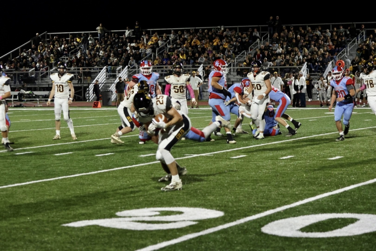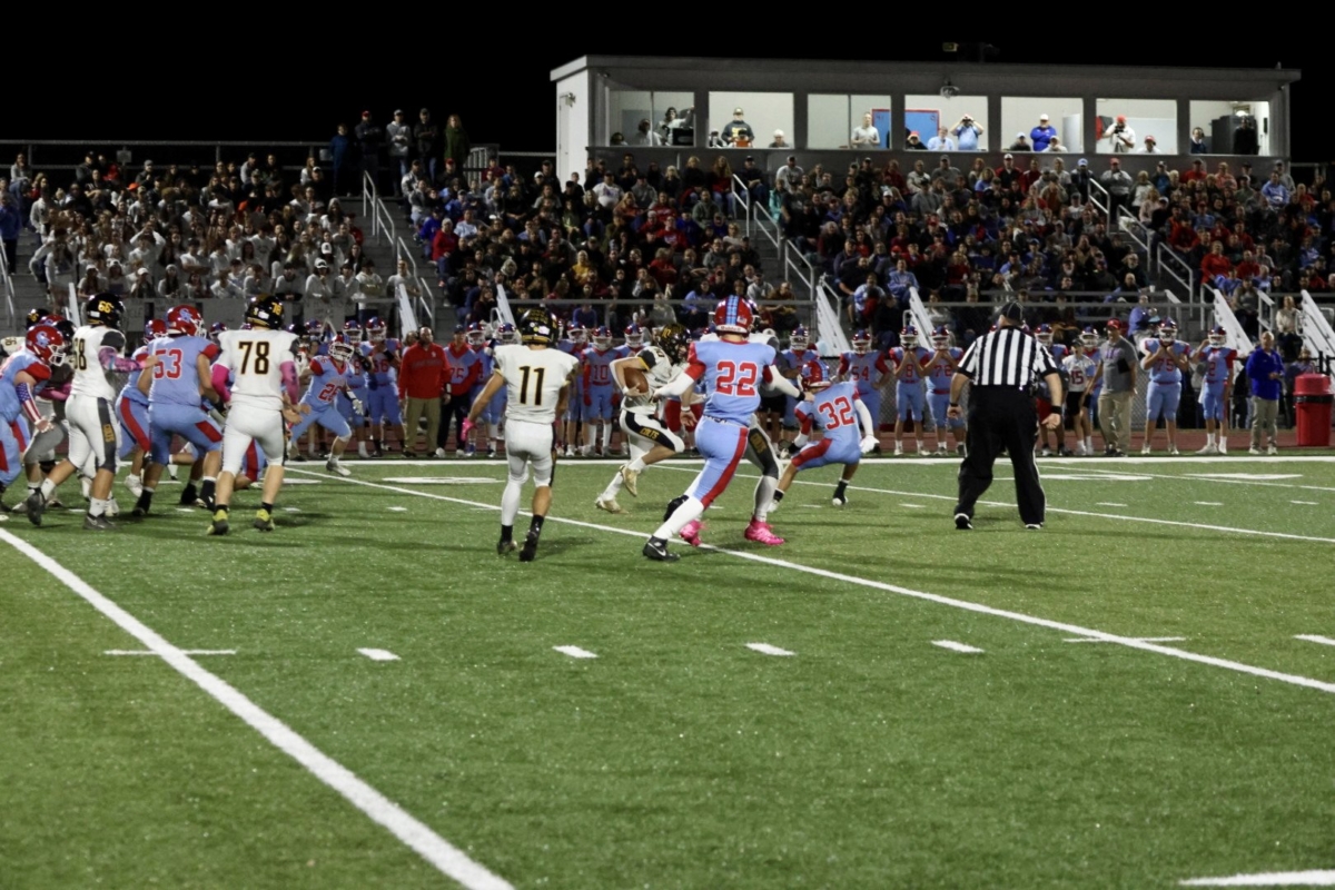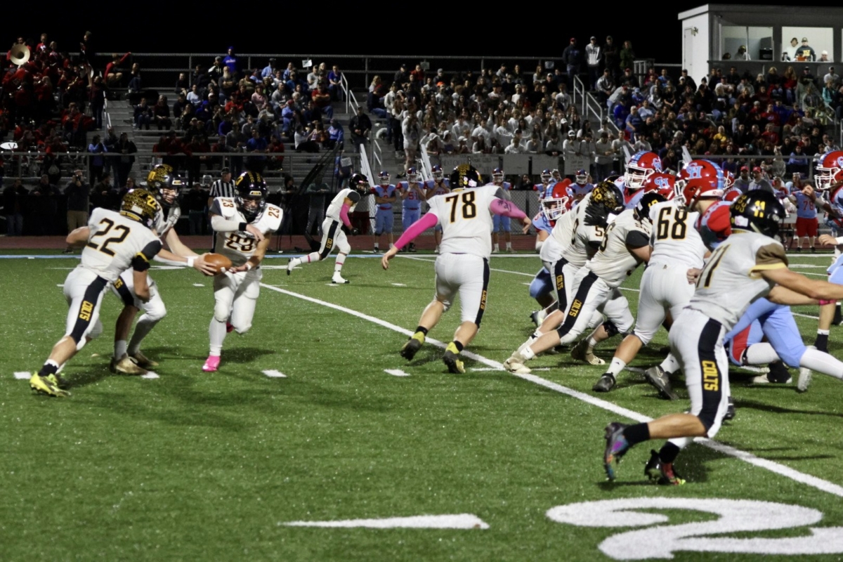 The Colts started fast, real fast. Junior Ty Dumm raced 75 yards on a quarterback keeper on the games first play. Both teams came into the game with pretty good offenses averaging over four touchdowns a game. Their defenses are playing pretty well also, allowing less than two. Both teams than went three and out. However the Highlanders picked up 24 yards on the exchange of punts. The Highlanders who like to ground and pound had trouble all night against the Colts front four. On their next series they were able to pick of some yardage with a pass that took them inside the Colts red zone. But on fourth down from the NC 13, running for his life quarterback Issac Weiland threw the ball away. He would do that more than once and should have done it a few more times. The Colts went three and out again. The punt which was nearly blocked made it to their own 36. The Highlanders got a big play in the ground game to get the ball inside the five. However a procedure penalty and an incomplete pass force them to kick a 22 yard field goal. Down 7-3 with almost three quarters to play CH had to feel good. Colts head coach Sam Shutty turned to Ty Dumm, a receiver at the start of the year to loosen up the Highlanders defense by throwing a series of short passes. The Colts drove 65 yards as Dumm completed five passes the last one a 15 yard over the shoulder catch by junior Caleb Dolney. The Highlanders would control the ball the next four minutes and get the ball to midfield, thanks to a muffed punt. CH punted again and the ball was downed at the Colts four. Two plays later Dumm made his only mistake of the game when he dropped the ball on the ground at his own three. Tristan Weakland recovered for the Highlanders. What do you do when you are a power running team and have four plays from your opponents three. You run the ball of course and the Colts defense knew it. Four plays later they had stuffed the Highlanders inches short. Dawson Shutty had an incredible game on the defensive line. He was just driving linemen back into their own backfield. He also did a nice job on offense. With 1:37 to go in the half and the Highlanders with only one time out , you would have expected the Colts to run three quarterback sneaks and go into the locker rooms. They passed three times from their own end zone, two were incomplete and a bubble screen nearly went for a safety. A great individual effort by Dolney saved the Colts two points. After the punt the Highlanders were 35 yards away and a minute and eight seconds. Two plays later Ty Dumm intercepted the first of his three picks and raced down the right sideline to the Highlanders 25. The Colts completed two passes but a holding penalty the first of several on the night forced them to try a 42 yard field goal as the half ended. The kick never got up and fail short. It was 14-3 Northern Cambria at the half.