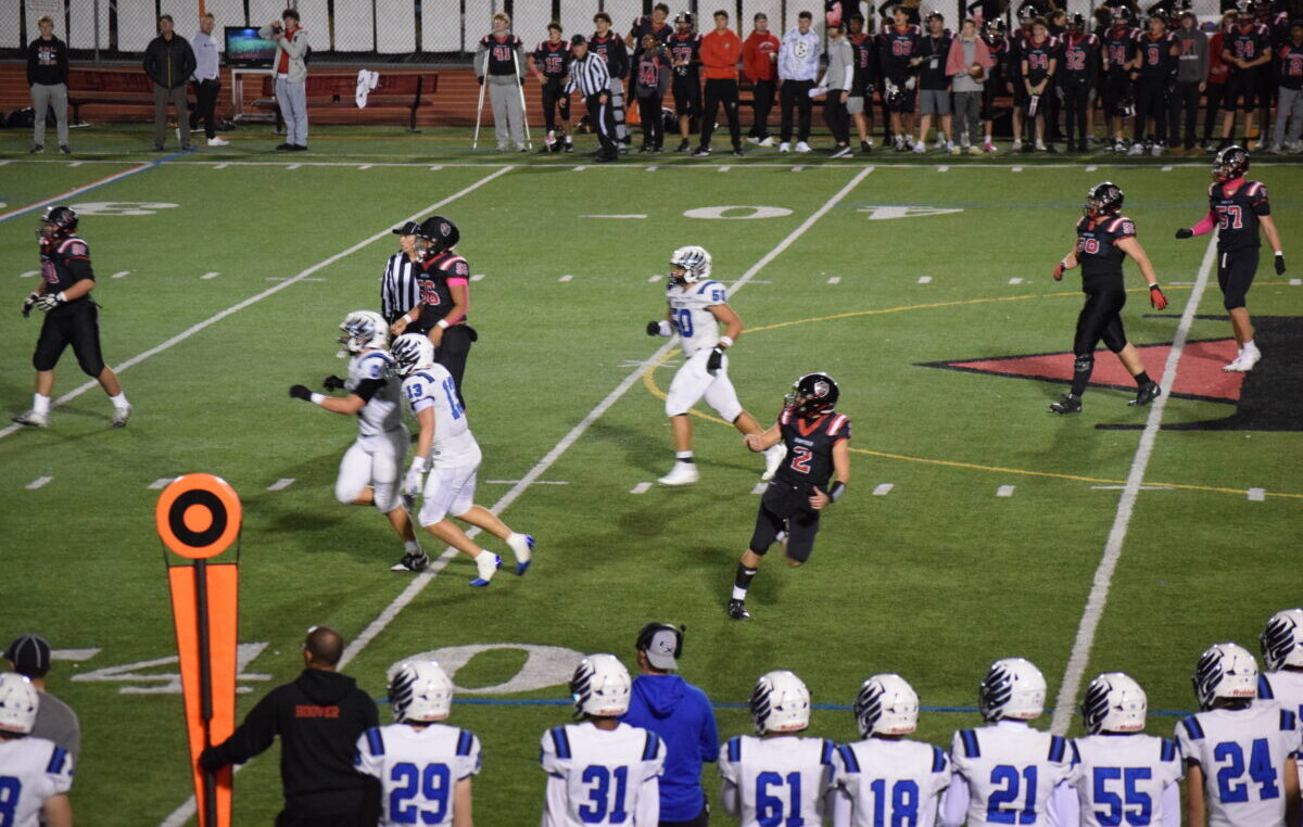 It may be a long time before football fans on both sides will see another game as good as this one. Hempfield came from behind and scored ten points in the fourth quarter. Then the Black Knights stopped a 2-point conversion inches short of the goal line late in the game to upset unbeaten Exeter 30-28 in a classic contest that will be talked about for years. The game was played on Hempfield’s home field on band recognition night before a rather large crowd.