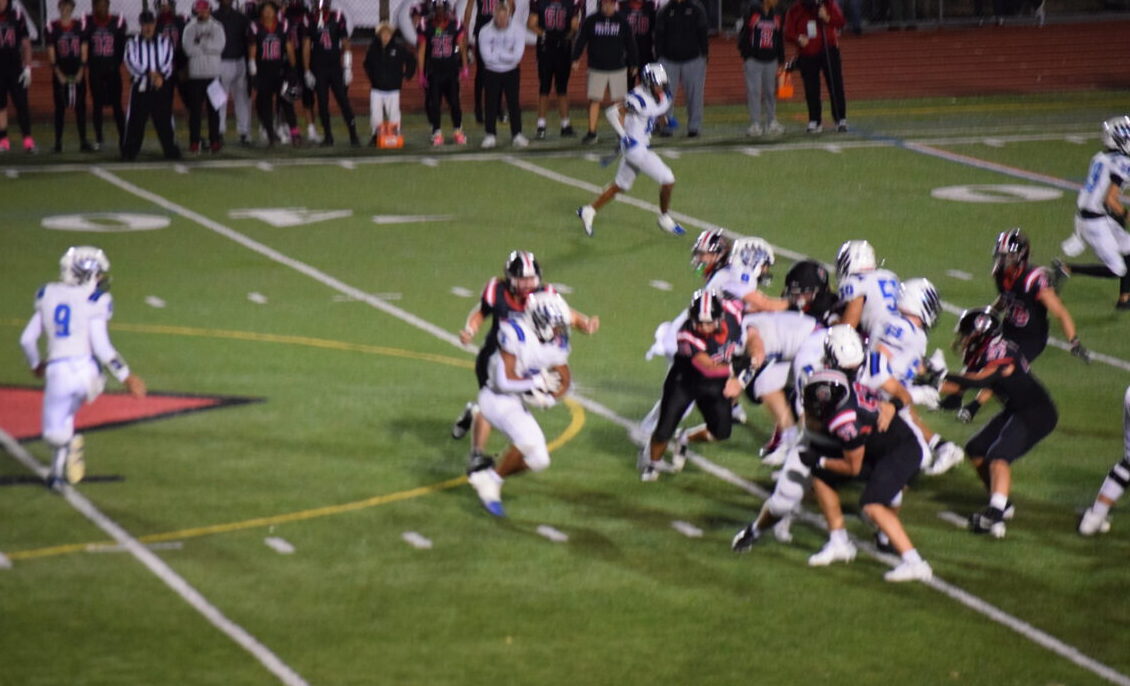 Leo Brown (center with ball) is spying out a crease. He ran for over 250 yards on the evening. QB Jake Hafer is #9 on left.