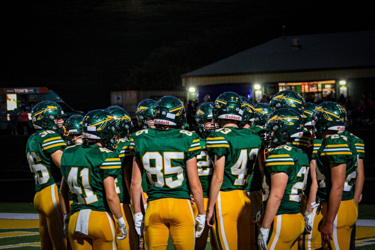 Penn-Trafford football players gather in a huddle before the game against Armstrong on Oct. 17. P-T won 42-7, earning a Class 5A WPIAL playoff spot.