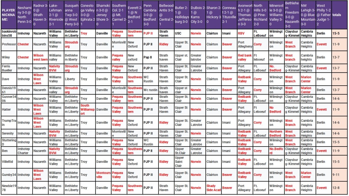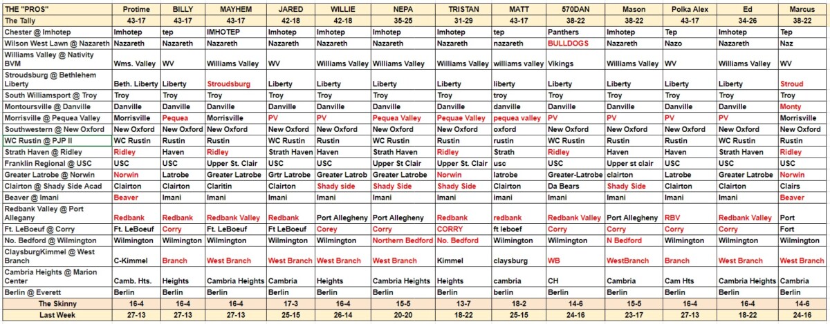 Week three is in the books and what a week it was for the PFN ProTime Pick’em Challenge. Bossman Billy had a spectacular week with his Ouija board, with a 17-3 record, bringing his season long record of 44-16, which leads the Challenge. As noted last week the Bossman has a predilection to lead early, but fade late. Refusing to bow to our fearless leader Matt was correct on 90% of his picks choosing an incredible 18-2 on the week, upping his season win total to 43. Jared was just one unlucky pick from Matt joining Bossman Billy with 17 wins. A gaggle of the “Pros” went 16-4, leading the way for the 16 game winners was ProTime Phil, Mayhem continued his winning ways joining the gang of 16, as well as Polka Al, Willie and shockingly Elon Ed also went 16-4. Seems it was nerd picking week, in Pennsylvania this week, with our top nerd’s computer selecting 16 wins, bringing his season win total 34-26!
