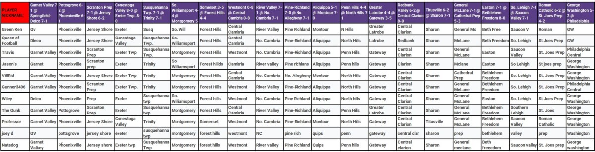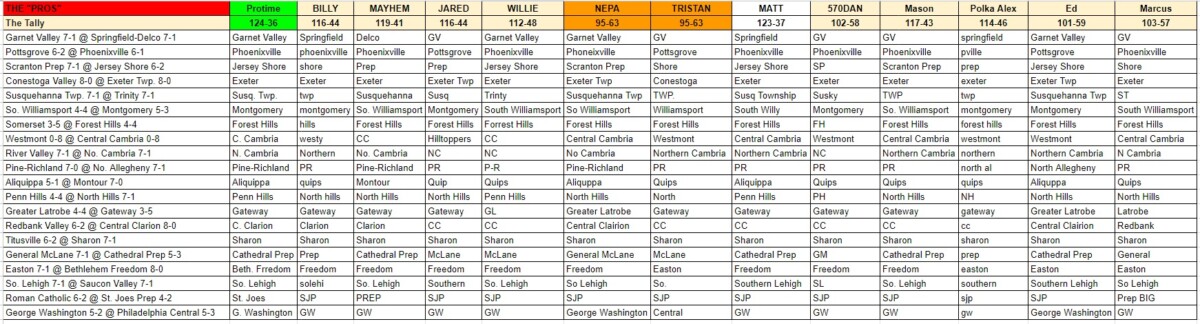 As a group the Pros have cobbled together a 1,437-643 record, a .69 winning percentage. Pulling that percentage down are NEPA and Tristan, coming off of an 11-win week, continue to battle it out for the race to the bottom. They sit in the cellar tied at 95 wins, trailing ProTime Phil by a mere 29 wins. The good news is both NEPA and Tristan should crack triple digits in wins after this week.