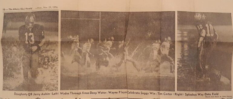 Wayne County 7 Dougherty 6 – On Saturday night November 27, 1976 the Wayne County Yellow Jackets defeated the Dougherty Trojans in a steady downpour at Dougherty’s home field in Albany. The game was a Georgia state AAA quarter-final playoff contest between a pair of 10-1 teams. What made this game so unique was that it was not only played in a downpour, but the field was covered with water up to several inches deep in various places as the game wore on because it had rained all day Friday too.