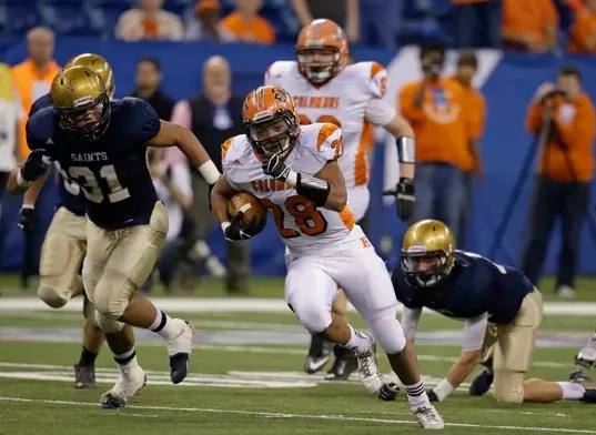 Columbus East 28 Fort Wayne Bishop Dwenger 27 – On Saturday Nov. 30, 2013 the 4A state title game at Lucas Oil Stadium was a real barn-burner with a couple of wild momentum swings. This game also featured a pair of pretty good offenses that combined for over 860 yards. Markell Jones led the way for Columbus East with 197 yards rushing and 2 touchdowns. Jones went on to Purdue, rushing for over 2,500 yards and scoring a total of 22 touchdowns in his career for the Boilermakers. The game started out all East as the Olympians built a 21-0 first half lead and appeared to be in control. But a funny thing happened on the way to the championship for the Olympians. The Saints of Bishop Dwenger came to play too.